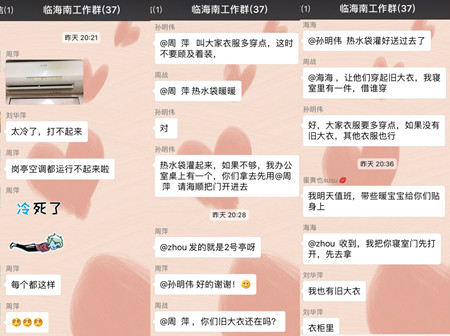 1月26日晚8:21分,臨海南收費(fèi)所微信工作群突然炸開了鍋。所有崗?fù)た照{(diào)因天氣太冷無法有效運(yùn)行,導(dǎo)致亭內(nèi)保暖效果不佳。當(dāng)班班長(zhǎng)將此情況反饋到微信工作群后,所里立即采取應(yīng)急措施,組織值班人員將熱水袋、保暖衣物等送往崗?fù)ぁP菹⒃诩业膯T工得知情況后,也紛紛建言獻(xiàn)物,貢獻(xiàn)自己的力量。在惡劣環(huán)境中,大家守望互助,支援一線,共渡難關(guān)。