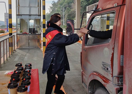 活動當天雖然氣溫較低,但是在臨海南收費所入口處,身著紅色綬的志愿者們依然熱情地為過往司乘人員遞一杯杯滾燙的姜茶,并過往大貨駕駛員發放優惠政策宣傳單。